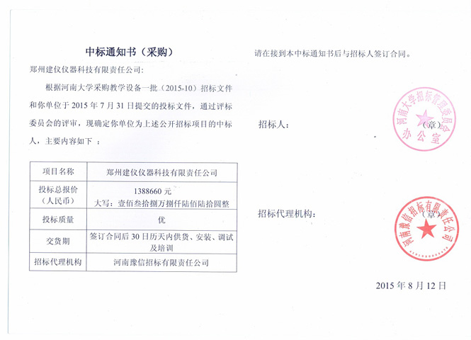 河南大學(xué)2015-962中標通知書