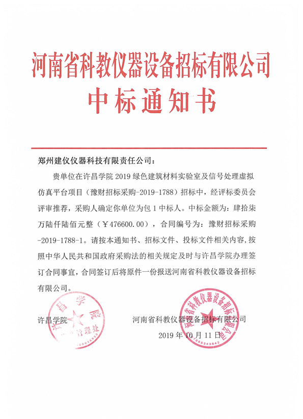 許昌學(xué)院2019-1788中標(biāo)通知書